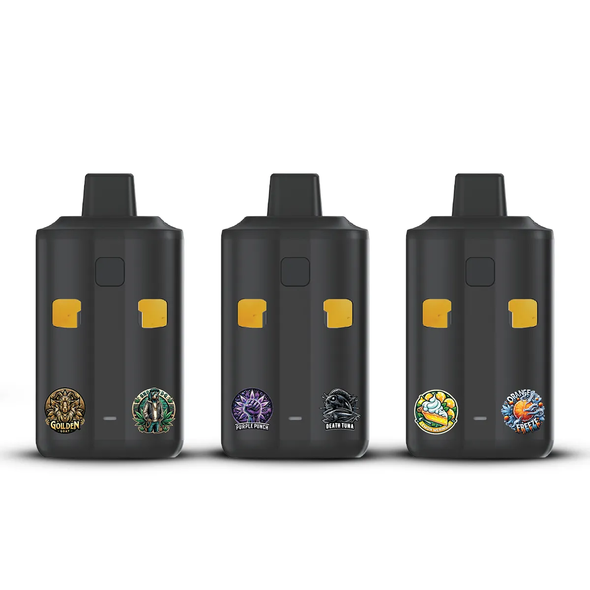Laughing Buddha x Pineapple Express, Golden Goat x Snoop Dogg OG, Lemon Meringue x Orange Freeze, Cherry Bomb x Banana Sherbet, Alien Gelato x Blueberry Diesel, Purple Punch x Death Tuna, Cherry Pie x Banana Sherbet